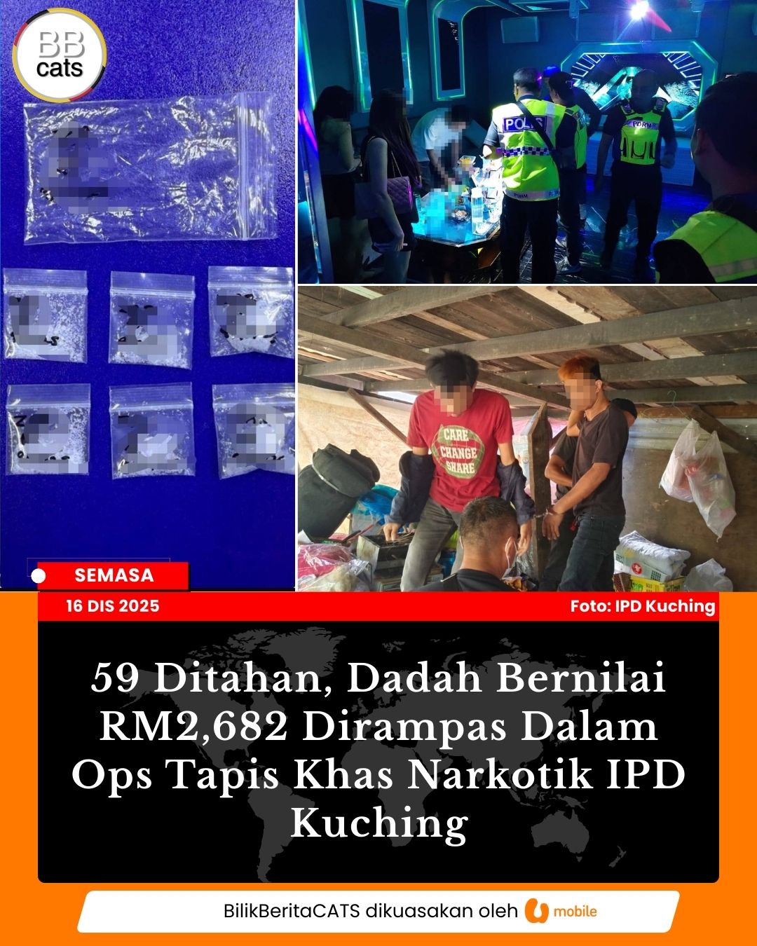 59 Ditahan, Dadah Bernilai RM2,682 Dirampas Dalam Ops Tapis Khas Narkotik IPD Kuching