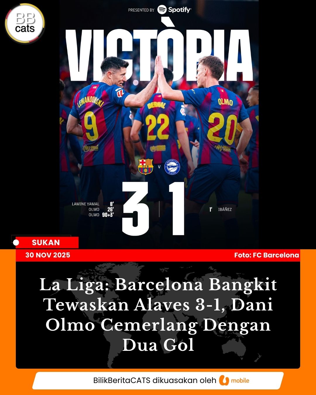 Dani Olmo meledak dua gol membantu Barcelona bangkit menewaskan Alaves 3-1 di Spotify Camp Nou, membawa Barca ke puncak Liga Sepanyol. Read more...