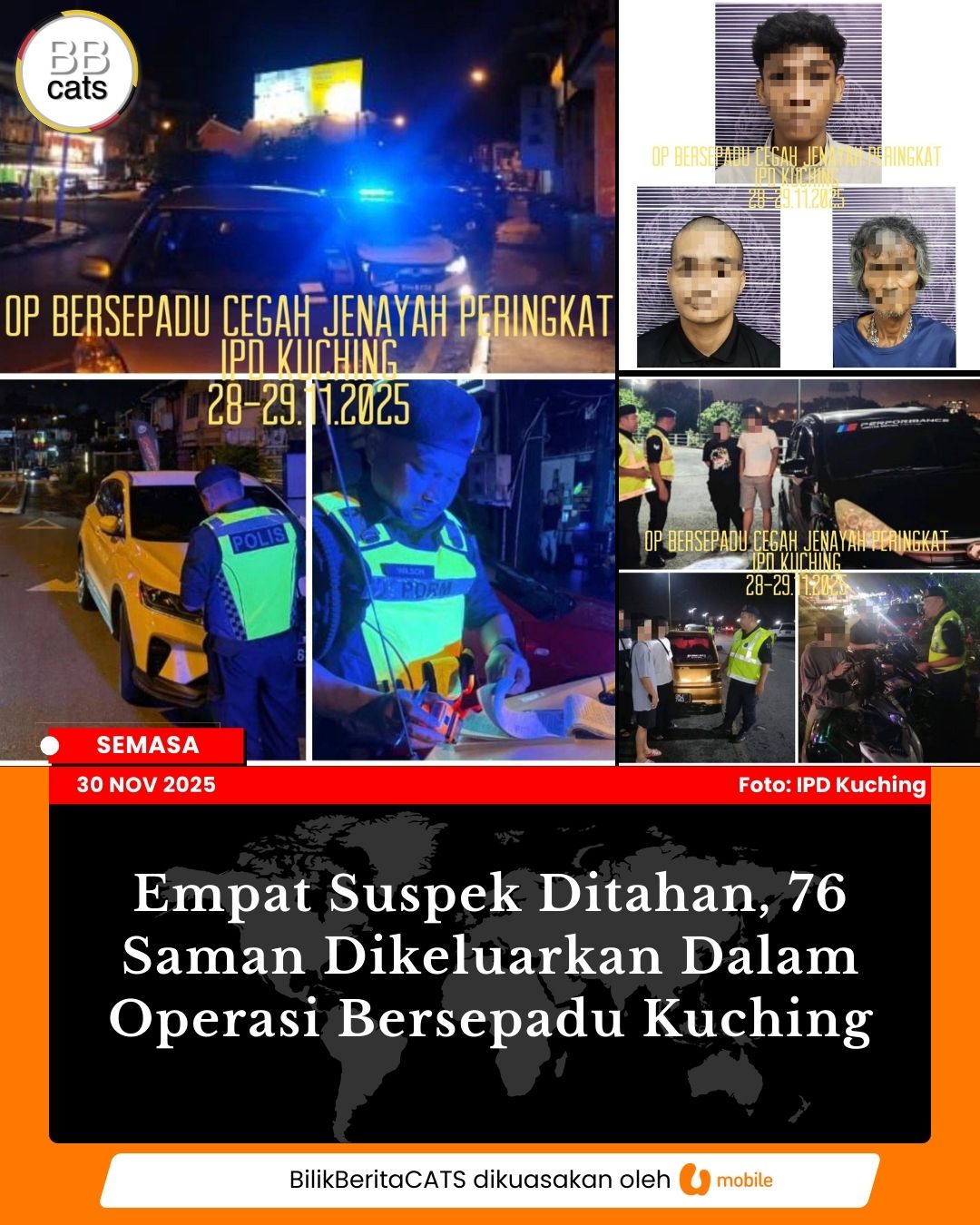 Polis Daerah Kuching menahan empat individu dan mengeluarkan 76 saman dalam Operasi Bersepadu Cegah Jenayah pada 28–29 November. Read more...