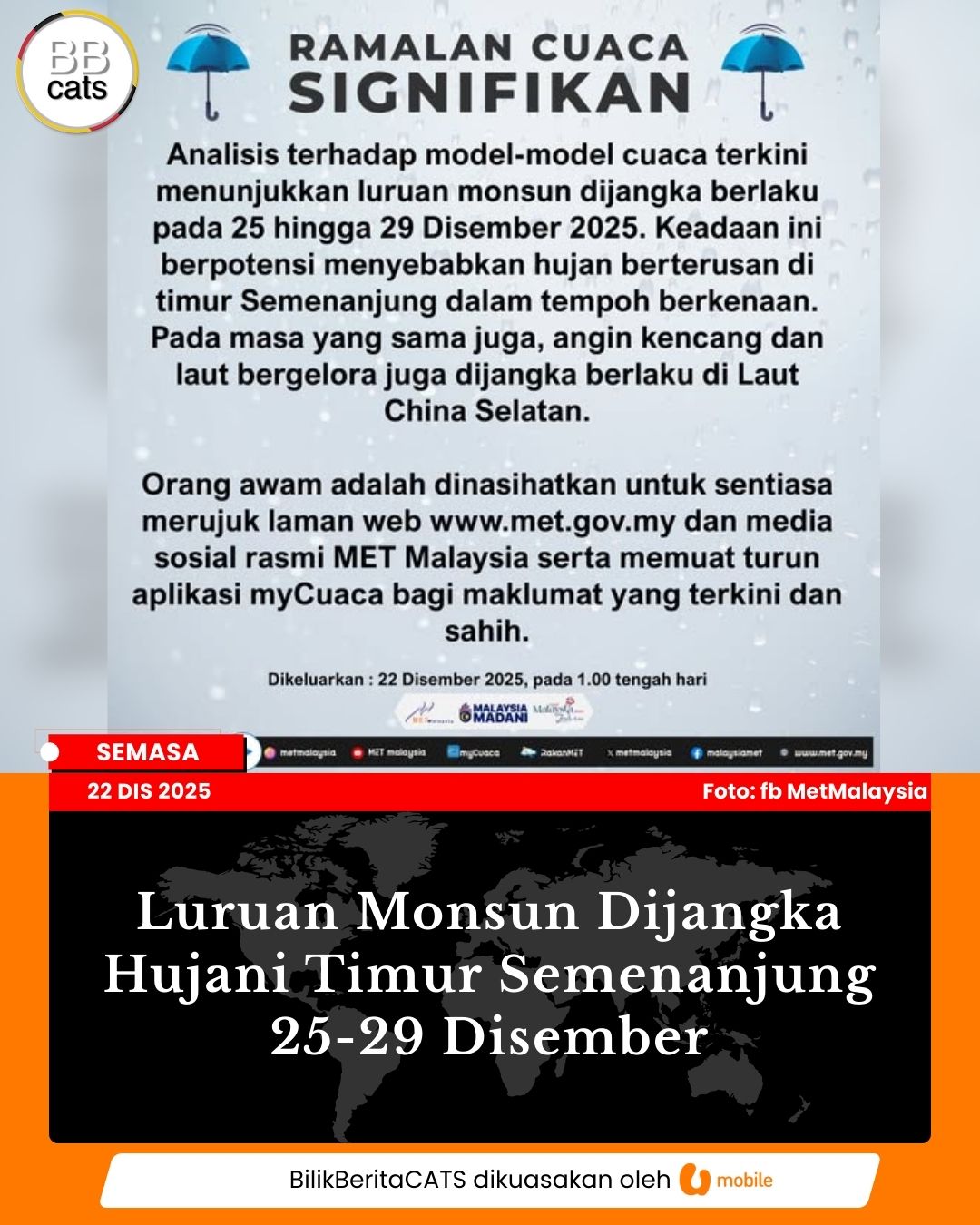 Jabatan Meteorologi Malaysia menjangka luruan monsun dari 25 hingga 29 Disember, berpotensi menyebabkan hujan berterusan di timur Semenanjung. Read more...