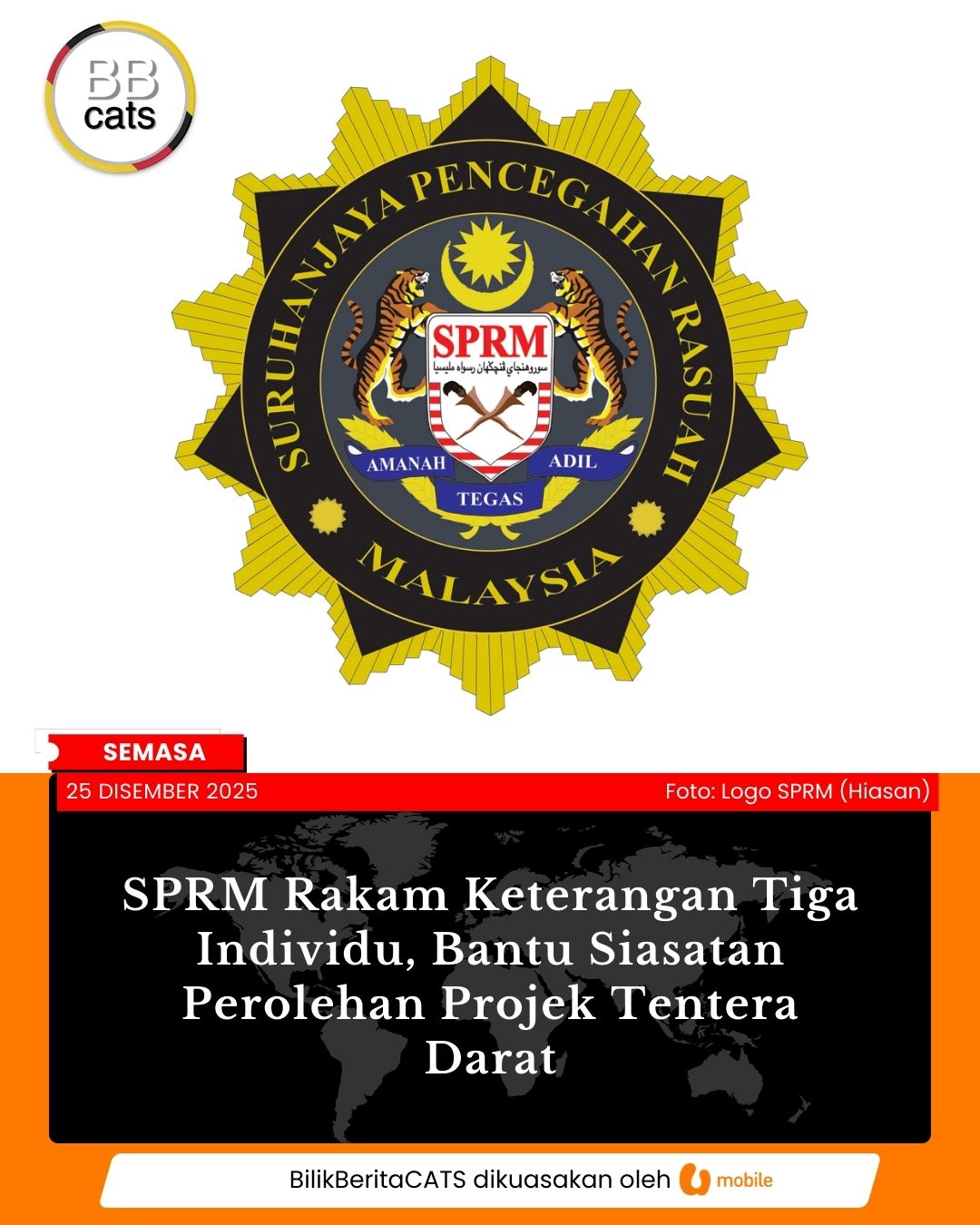Suruhanjaya Pencegahan Rasuah Malaysia (SPRM) telah merakam keterangan tiga individu bagi membantu siasatan berhubung perolehan projek Tentera Darat, semalam. Read more...