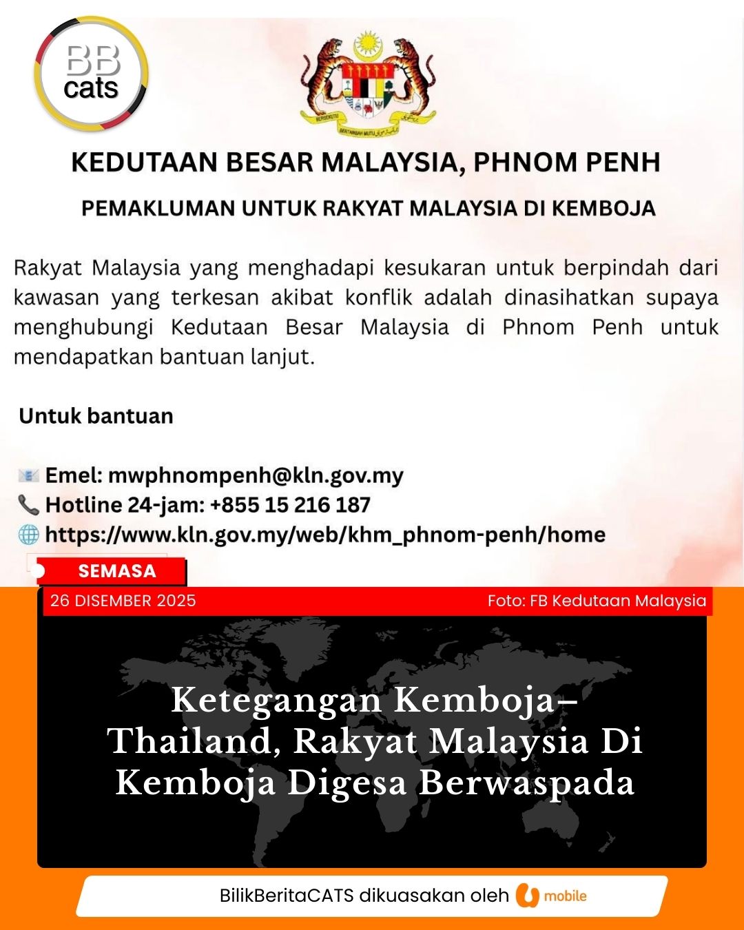 Konflik Kemboja-Thailand, Rakyat Malaysia dinasihatkan supaya menghubungi Kedutaan Besar Malaysia untuk mendapatkan bantuan. Read more...