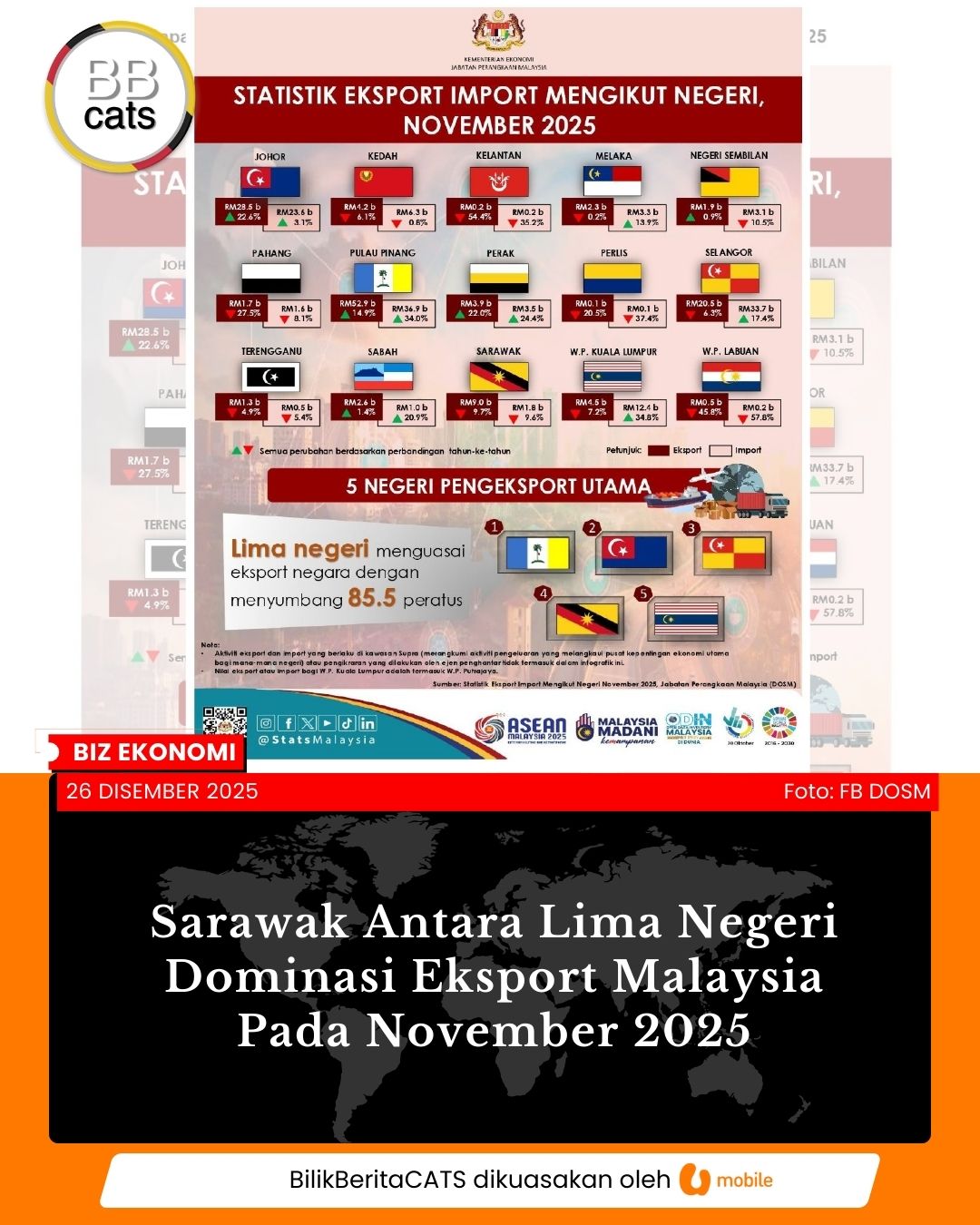 Sarawak antara lima negeri mendominasi eksport Malaysia, menyumbang 85.5 peratus daripada jumlah keseluruhan pada November 2025. Read more...