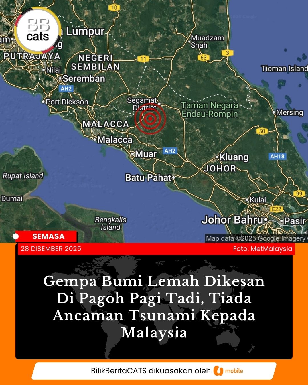 Gempa Bumi Lemah Dikesan Di Pagoh Pagi Tadi, Tiada Ancaman Tsunami Kepada Malaysia
