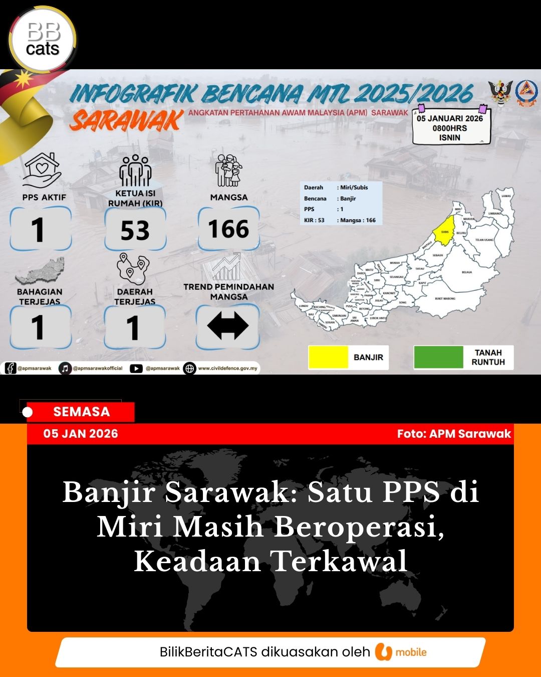 Situasi banjir di Sarawak setakat pagi ini kekal terkawal dengan satu PPS masih beroperasi di Miri Read more...