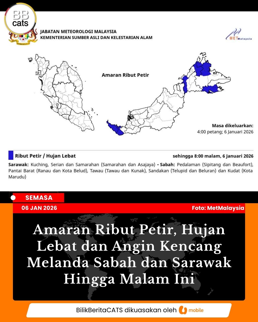 Jabatan Meteorologi Malaysia (MetMalaysia) mengeluarkan amaran ribut petir, hujan lebat dan angin kencang melibatkan beberapa kawasan di Sabah dan Sarawak Read more...