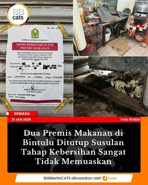 Lembaga Kemajuan Bintulu (BDA) mengarahkan penutupan dua premis makanan selepas pemeriksaan mendapati tahap kebersihan sangat tidak memuaskan. Read more...