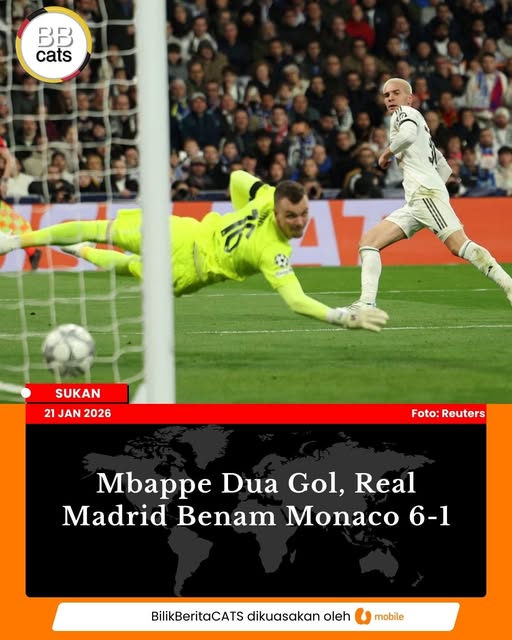 Real Madrid meraikan kemenangan bergaya 6-1 ke atas Monaco dalam aksi Liga Juara-Juara, dengan Kylian Mbappe menjaringkan dua gol manakala Jude Bellingham turut menyumbang jaringan. Read more...