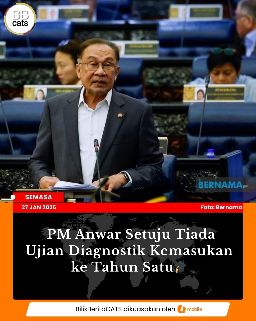 Perdana Menteri Datuk Seri Anwar Ibrahim bersetuju ujian diagnostik kemasukan Tahun Satu bagi kanak-kanak enam tahun tidak dilaksanakan mulai 2027 Read more...