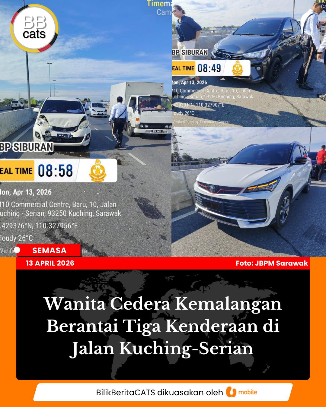 Seorang wanita cedera selepas terlibat dalam kemalangan berantai yang melibatkan tiga buah kenderaan di Batu 10, Jalan Kuching-Serian. Read more...