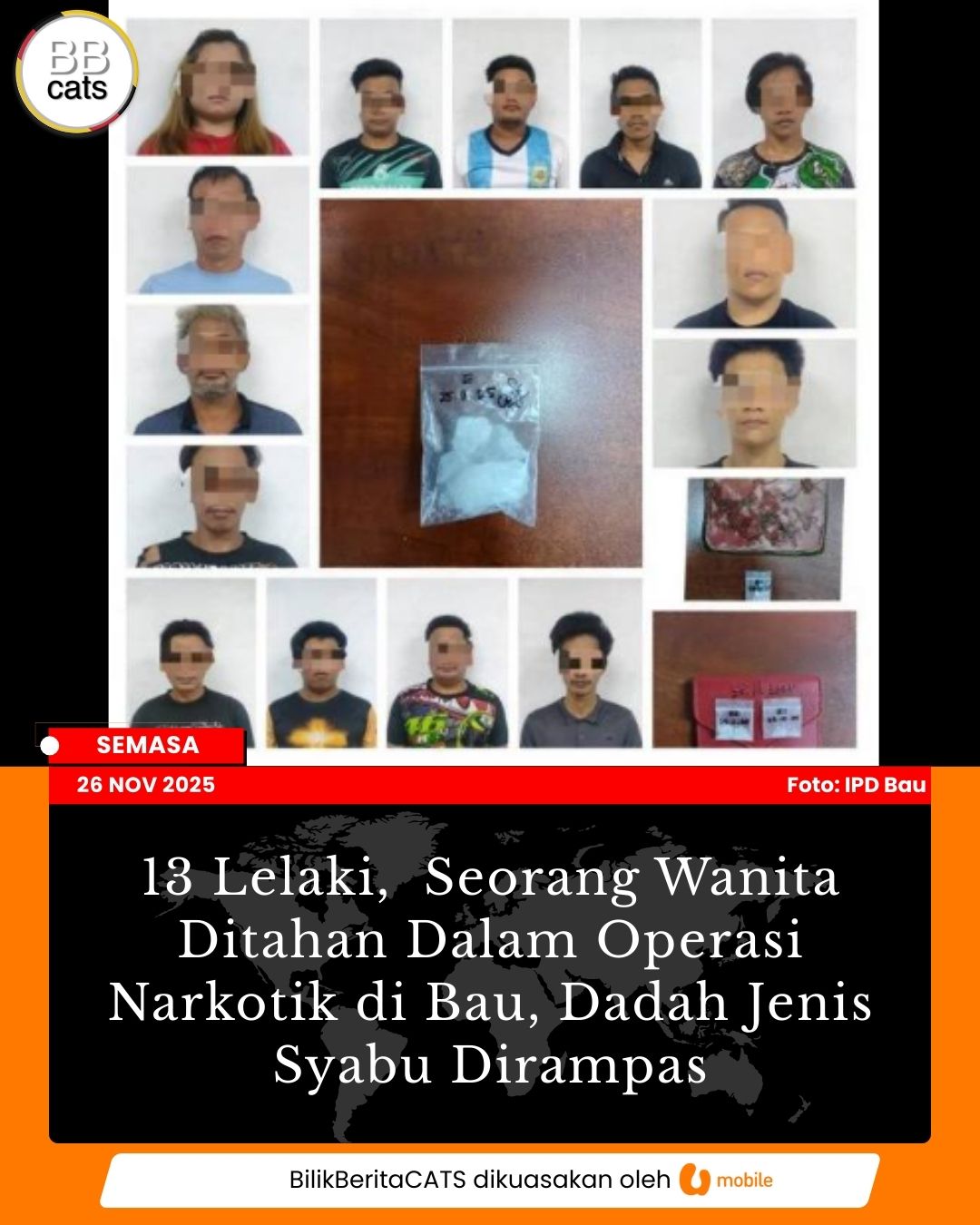 13 Lelaki, Seorang Wanita Ditahan Dalam Operasi Narkotik di Bau, Dadah Jenis Syabu Dirampas