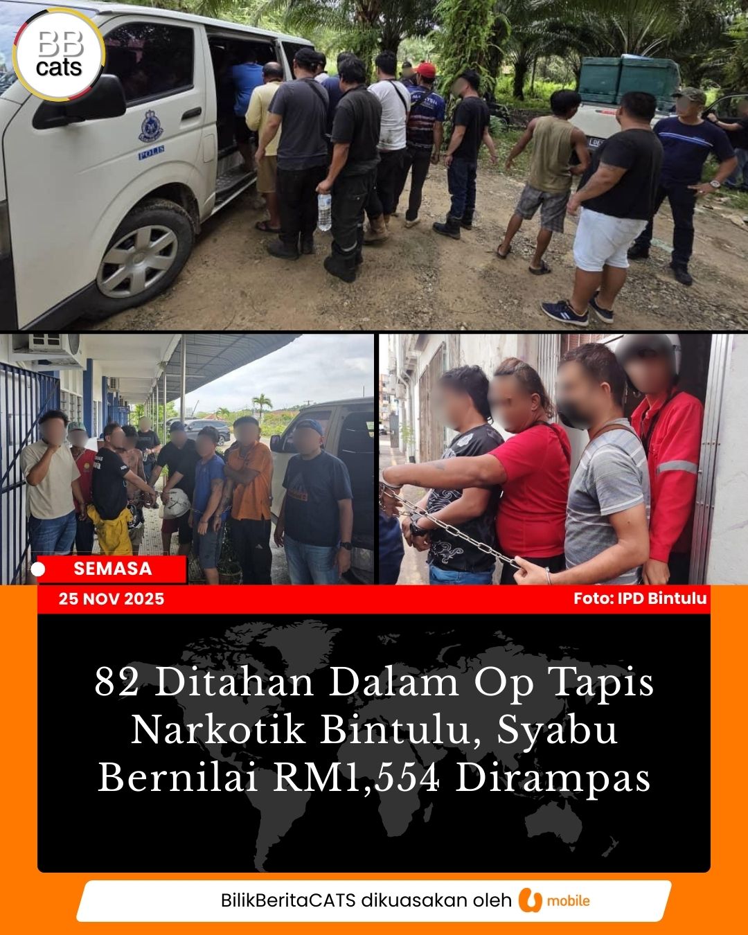 Seramai 82 individu ditahan dalam Op Tapis Narkotik di Bintulu, termasuk 71 penagih, dengan rampasan 11.3 gram syabu bernilai RM1,554 Read more...