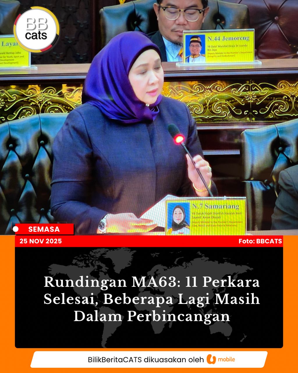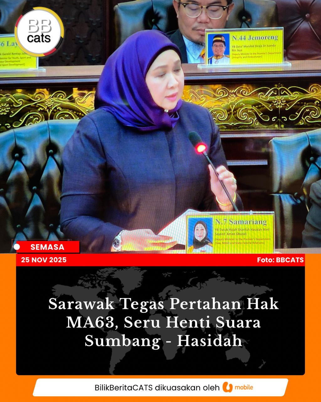 Sebanyak 11 perkara utama berkaitan MA63 disahkan selesai hasil rundingan antara Kerajaan Sarawak dan Kerajaan Persekutuan setakat November 2025, kata Timbalan Menteri di Pejabat Premier, Datuk Sharifah Hasidah Sayeed Aman Ghazali. Read more...