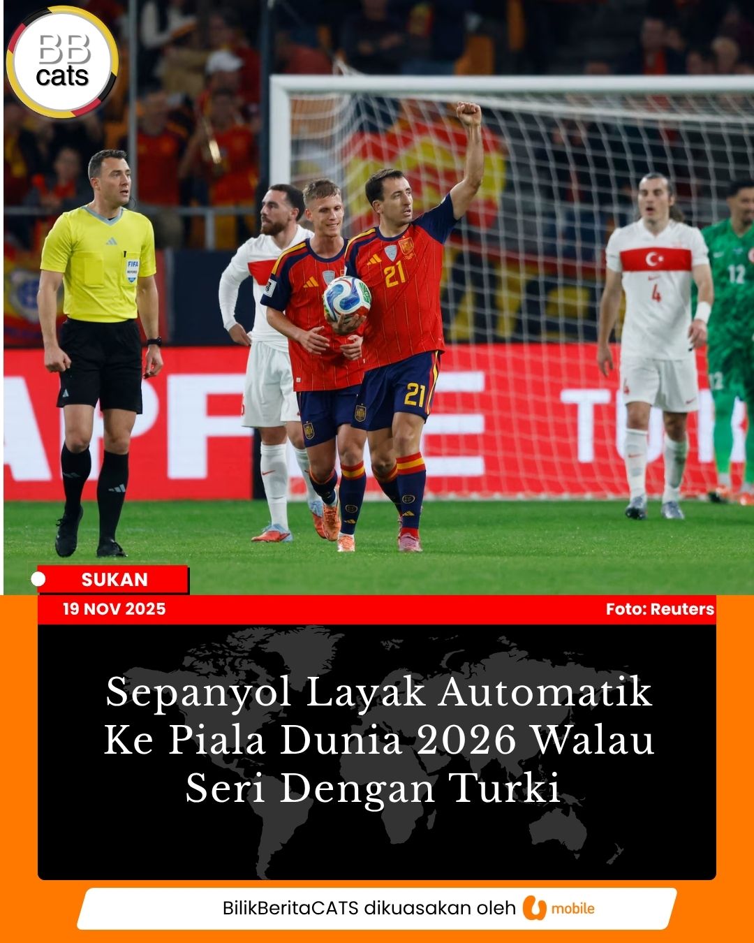 Sepanyol mengesahkan kelayakan automatik ke Piala Dunia 2026 walaupun seri 2-2 menentang Turki di Seville. Read more...